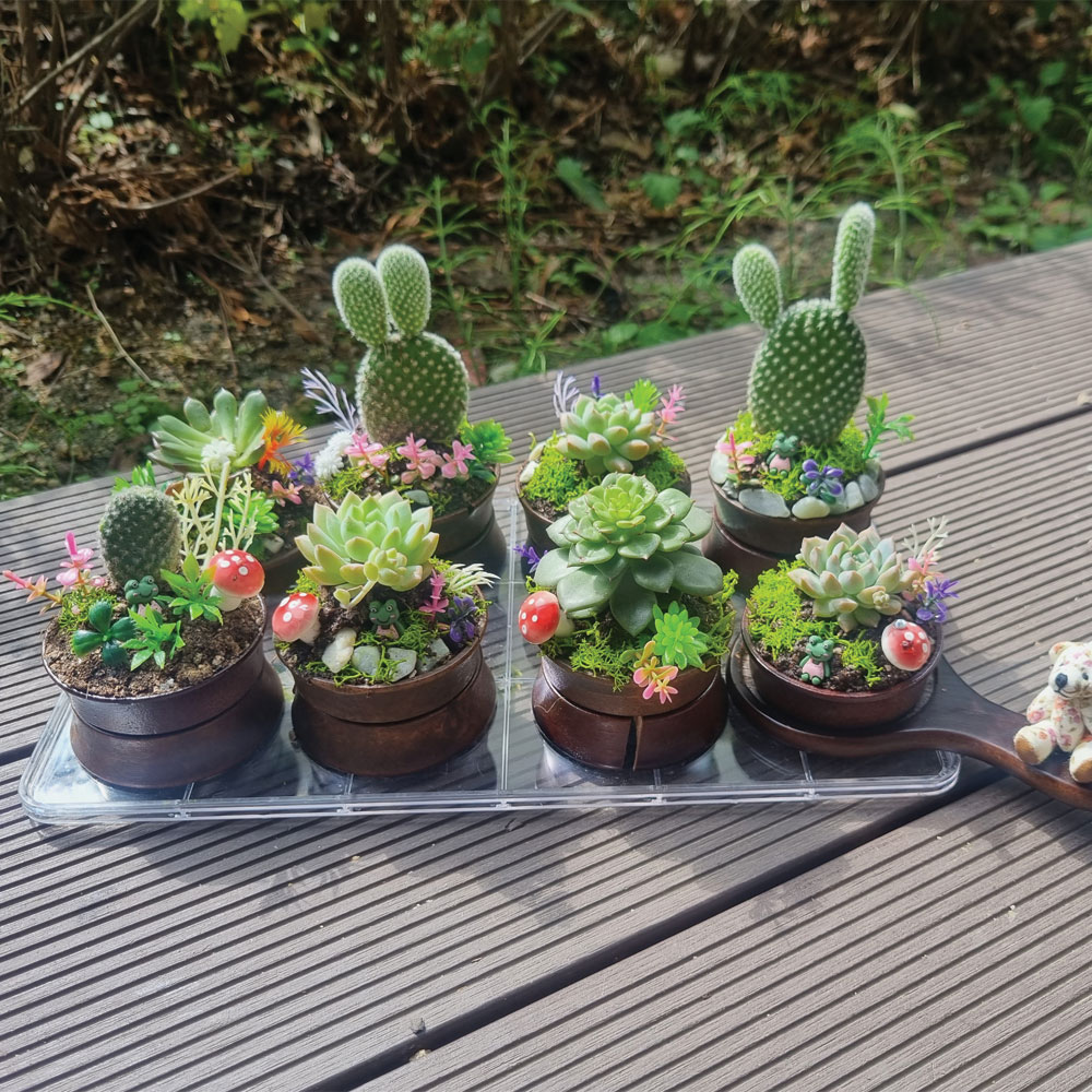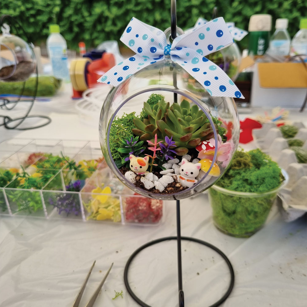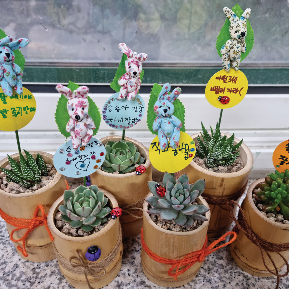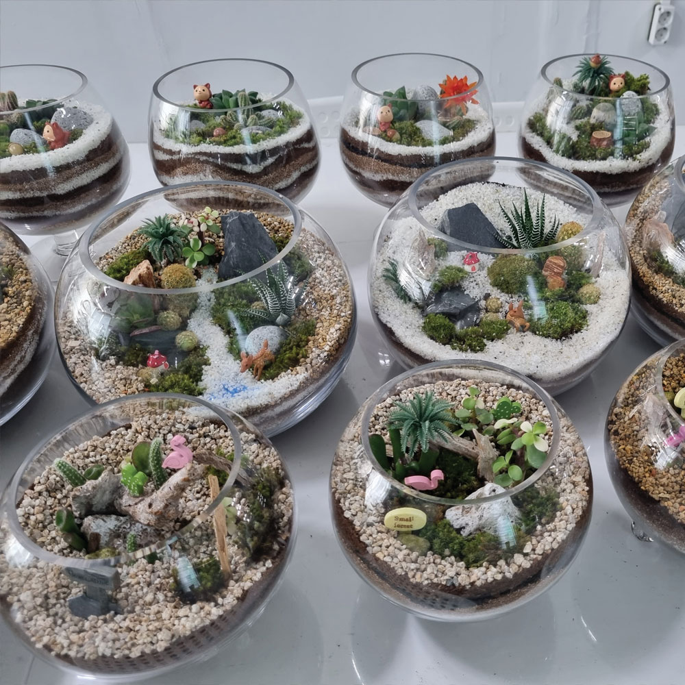 - 식물을 이용하여 여러 가지 재료들로 인테리어 소품을 만드는 직업체험 - 미니다육화분만들기- 행잉테라리움- 대나무테라리움